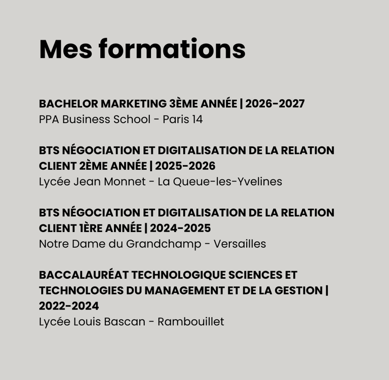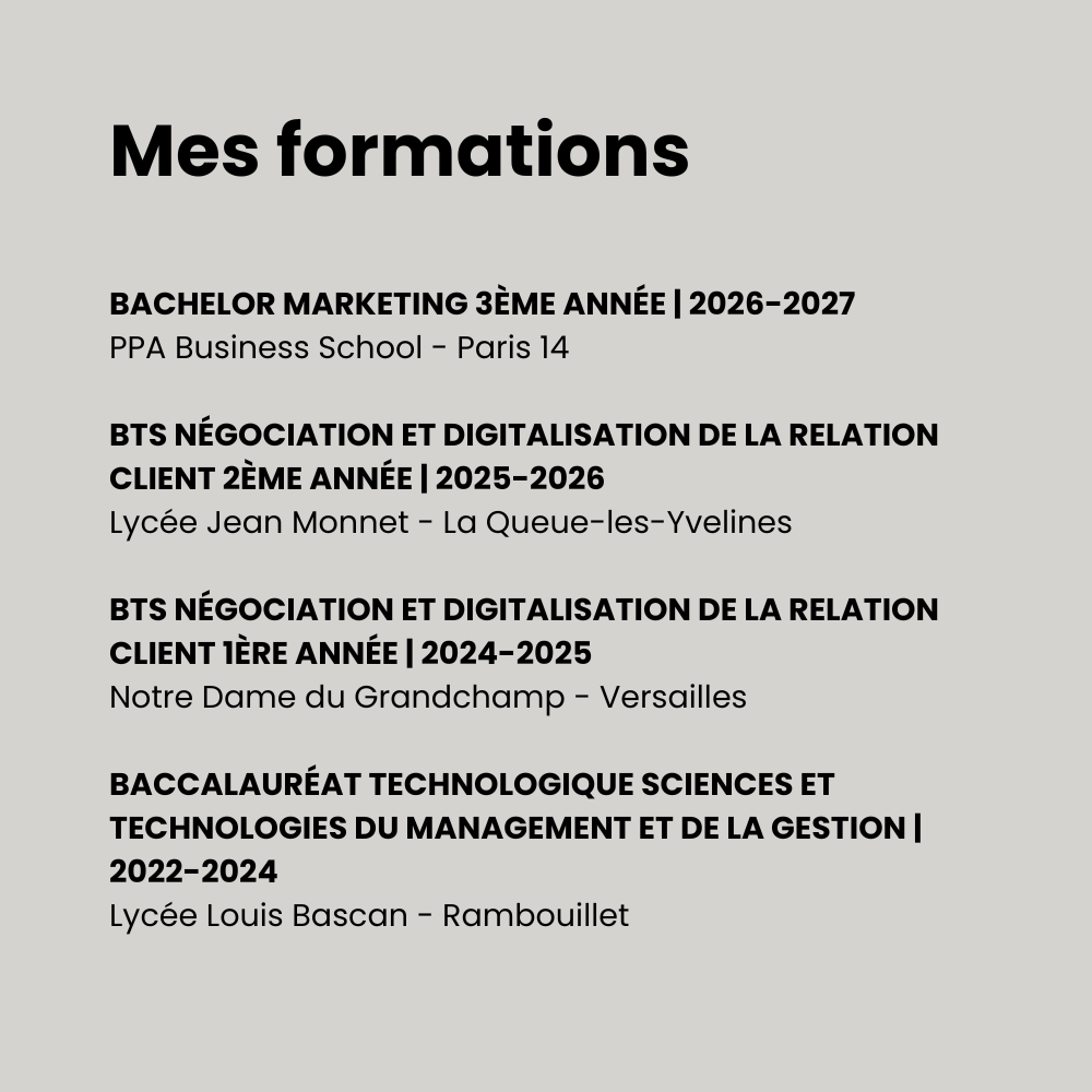 Étudiant en Bachelor Marketing à la recherche d’une alternance, je souhaite mettre mes compétences en marketing digital, création de contenus et relation client au service de projets concrets au sein d'une entreprise.